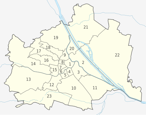 | 15 | Rudolfsheim-Fünfhaus | 1892 (bis 1938: 14., Rudolfsheim bzw. 15., Fünfhaus, dann bis 1957 Bezirksname Fünfhaus) | 391,8 | 75.902 | 19.373 | 29.852 | ||