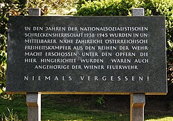 | Dieses Foto zeigt das im digitalen Kulturgüterverzeichnis der Gemeinde Wien (Österreich) unter der Nummer 91359 ( commons , de ) aufgeführte Objekt. | Eigenes Werk | GuentherZ | Datei:GuentherZ 2013-05-14 0335 Wien22 Donaupark Gedenktafel an fruehere Hinrichtungsstaette.jpg | |