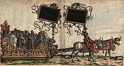 | „Musica Canterey“, Triumphzug, Holzschnitte 25 und 26 von Hans Burgkmair, 1517–18; koloriert von Joseph Hoeger, 1765. | Universitätsbibliothek Graz. | Hans Burgkmair / Joseph Hoeger | Datei:Triumphzug Kaiser Maximilian.jpg | |