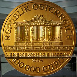 - ↑ Informationen zum Philharmoniker mit 20 Unzen Feingold auf der Seite der Münze Österreich ( vom 11. Oktober 2011 im Internet Archive)