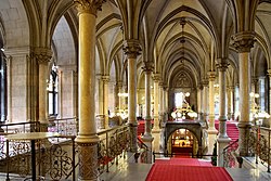 Vom Rathauseingang am Friedrich-Schmidt-Platz 1 führen zwei Stiegen zum Gemeinderatssitzungssaal im 1. Stock. Am Fuß der beiden Stiegen befand sich einst eine überdachte Vorfahrt für die in Kutschen zu den Sitzungen kommenden Gemeinderäte. Später wurde hier ein Feuerwehrwagen abgestellt; um 1970 wurde die ehemalige Vorfahrt zum Rathausinformation genannten Informationsbüro umgebaut, das heute Stadtinformation (Stadtservice Wien) heißt.[12]