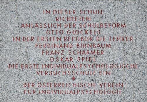 Gedenktafel Erste Individualpsychologische Versuchsschule. VS Staudingergasse 6, Brigittenau. | Christian Michelides | Christian Michelides | Datei:Gedenktafel Erste Individualpsychologische Versuchsschule (Wien).jpg |