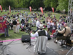 | '16er Buam' performance at Vienna's annual Stadtfest, 2009, in 'Burggarten'. Note: Camera timesetting is UTC, which is local time -2. | Eigenes Werk | User:W. | Datei:16er Buam 20090426 172.jpg | |