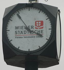 | Wiener Würfeluhr zur Anzeige der Normalzeit, Zifferblatt als Werbefläche der Wiener Städtischen Versicherung | Eigenes Werk | GuentherZ | Datei:GuentherZ 2008-03-21 0634 Wiener Wuerfeluhr Wr. Staedtische.jpg | |