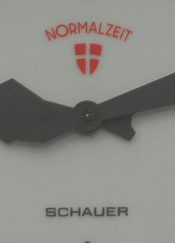 | Traditionelle Schrift auf den Zifferblättern der Wiener Würfeluhren: „Normalzeit“, „Schauer“ (Herstellerfirma) und das Wappen der Stadt Wien | Eigenes Werk | GuentherZ | Datei:GuentherZ 2008-03-22 0658 Wiener Wuerfeluhr Schrift.jpg | |