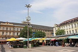 | Benediktinermarkt (Tagesmarkt) in Klagenfurt mit Wiener Würfeluhr | Eigenes Werk | Mefusbren69 | Datei:Klagenfurt - Benediktinermarkt.JPG | |