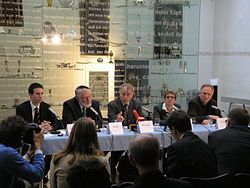 | The Austrian political scientist Anton Pelinka at a news-conference in the Jewish Museum of Vienna (centre). Also present from the left is Dr. Ingo Zechner , the former general-secretary Avshalom Hodik of the Jewish Community, Brigitte Bailer-Galanda of the Documentation Centre of Austrian Resistance, and the historian Bertrand Perz . The occasion was the founding of a Vienna Simon-Wiesenthal-Centre for Holocaust Studies ( VWI ). | Eigenes Werk | Gryffindor | Datei:Pelinka Vienna June 2006 016.jpg | |