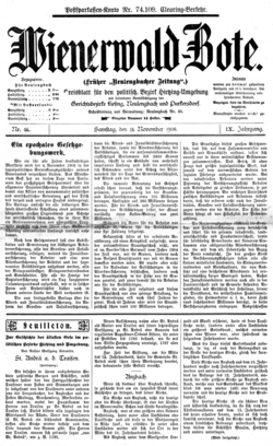 | Titelblatt der Ausgabe vom 14. November 1908 der Zeitung "Wienerwald-Bote" | Anno (Austrian Newspapers Online) 1 | unbekannt | Datei:Wienerwald-Bote.png |