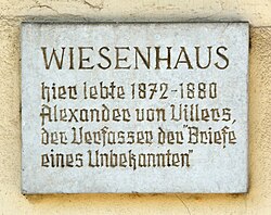 | Das Wiesenhaus in Neulengbach, Liechtensteinsche Gutsverwaltung, ehemals Wohnhaus von Alexander von Villers. | Eigenes Werk | Herzi Pinki | Datei:Wiesenhaus Neulengbach, plaque Villers.jpg | |