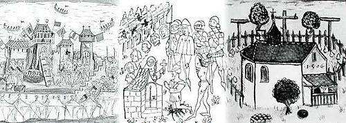 | Greifensee (ZH) : Belagerung von Schloss Greifensee im Mai 1444 während des Alten Zürichkriegs . Dargestellt sind (von links) Belagerung - Hinrichtung auf der «Blutmatte» - Gedenkkapelle. Aus der «Zürcher Chronik» 1485-1486 von Gerold Edlibach (1454-1530). | Gemeinde Greifensee, Fotoalbum | Gerold Edlibach (1454-1530) | Datei:Greifensee - Mord von Greifensee.jpg | |