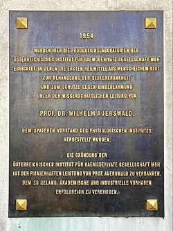 Gedenktafel (1954) für Wilhelm Auerswald im Physiologischen Institut in Wien. | Eigenes Werk | Funke | Datei:Physiologisches Institut Gedenktafel Wilhelm Auerswald 1954.jpg | |