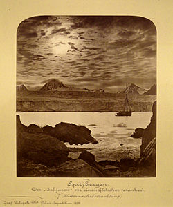 | Sailing boat 'Isbjörn' anchored in front of some glacier in Spitsbergen. This photograph was taken by Austrian photographer en:Wilhelm J. Burger when he accompagnied the Wilczek expedition which was needed to prepare the Payer-Weyprecht expedition. It is one of the earliest documents from that region, and it is held by (and, to some extent, "was stolen from" ;) Vienna's en:Albertina museum. | Urheber | Wilhelm Burger | Datei:Spitsbergen 1872, by Austrian photographer Wilhelm Burger (1844-1920).jpg | |