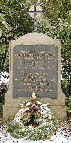 Am 10. Februar 1923 starb Wilhelm Conrad Röntgen im Alter von 77 Jahren an Darmkrebs in München. Er ist aufgrund seines testamentarischen Wunsches auf dem Alten Friedhof in Gießen begraben (gegenüber der Grabstätte des Pioniers der Hämodialyse, Georg Haas), wo bereits Röntgens Eltern ihre letzte Ruhestätte gefunden hatten. Entgegen der üblichen Schreibung Conrad ist sein zweiter Vorname in der Inschrift des Grabsteins als Konrad zu lesen. Die Reste seines Vermögens gingen an wohltätige Einrichtungen, darunter an die Armenpflege in Weilheim,[27] wo er ein Landhaus besaß.