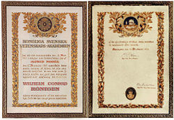 | Nobel Prize diploma of Wilhelm Conrad Röntgen | http://www.uni-wuerzburg.de/en/ueber/university_of_wuerzburg/roentgenring_science_mile/nobel_laureates/wilhelm_conrad_roentgen_1901/ | Sofia Gisberg (1854–1926) (see: nobelprize.org and Manfred Neureiter: Lexikon der Exlibriskünstler , p. 157) | Datei:Nobel Prize diplom Wilhelm Conrad Röntgen.jpg | |