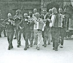 | Konzentrationslager Mauthausen, 30.07.1942: Eine aus Häftlingen bestehende Musikkapelle | Fédération Nationale des Déportés et Internés, Résistants et Patriotes (FNDIRP), 10 rue Leroux 75116 Paris (France), Tél : 01 44 17 38 38, Fax : 01 44 17 38 44, contact : fndirp@fndirp.asso.fr | Fritz Kornatz (SS-Oberscharführer) 1 | Datei:Musikkapelle Mauthausen.jpg | |
