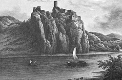 | Historische Ansicht von Burg Schreckenstein (heute Strekov) bei Aussig a. d. Elbe (Ústí n. L.) in Tschechien. Stahlstich. | Wolfgang Schwarze: "Romantische Reise durch den historischen Deutschen Osten". Gondrom Verlag, Bindlach, 1989. ISBN 3-8112-0632-X | Wilhelm Kandler | Datei:Ansicht Schreckenstein um 1850.jpg | |