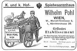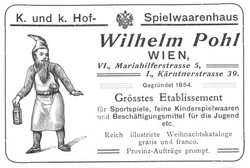 - ↑ Sport- und Spielwarenhaus Wilhelm Pohl, Wien. In: Kaiser-Festnummer Österreichs Illustrierte Zeitung. Verlag Jacques Philipp, Wien, 2. Dezember 1908, S. 150/XVIII, abgerufen am 31. Juli 2009.