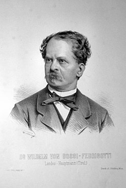 | Wilhelm von Bossi-Fedrigotti (1823-1905), Landeshauptmann von Tirol, Dr. jur., k. k. Hofrat, Abgeordneter zum Reichsrat für Tirol. Lithographie von Adolf Dauthage, ca. 1880 | Eigenes Foto einer Originallithographie der ÖNB (Wien) | Adolf Dauthage (1825-1883) | Datei:Wilhelm von Bossi-Fedrigotti Litho.jpg |
