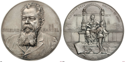 Die Vorderseite zeigt die Büste Hartels schräg von vorne. Zu den Seiten steht sein Name in latinisierter Form. Am linken Rand ist die Signatur des Medailleurs Anton Scharff platziert.Die Rückseite zeigt zentral eine Belehrungsszene. Im Hintergrund ist ein Panorama der Stadt Wien zu sehen. Im oberen Bereich befindet sich die Widmung und das Prägejahr auf Latein. | https://www.ikmk.uni-tuebingen.de/object?id=ID1853 | Stefan Krmnicek | Datei:Medaille Wilhelm von Hartel 1896.png | |