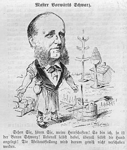| Master Vorwärts Schwarz . Karikatur des Organisators der Wiener Weltausstellung , Wilhelm Schwarz-Senborn . Transkription: Master Vorwärts Schwarz. Sehen Sie, hören Sie, meine Herrschaften! So bin ich, so ist der Baron Schwarz! Ueberall selbst dabei, überall selbst die Hand angelegt! Die Weltausstellung wird darum gewiß nicht verschoben werden. | Figaro Nr. 17. Wien, den 13. April 1872, XVI. Jahrgang. S. 66 (anno.onb.ac.at) | Unbekannt Unknown | Datei:Master Vorwaerts Schwarz.jpg | |