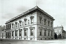 Der wachsende architektonische Einfluss der Neorenaissance am Wilhelmplatz zeigte sich ab 1894 auch am vom Königlichen Landbauinspektor Hermann Ditmar entworfenen Gebäude an der südlichen Ecke Zietenplatz /Wilhelmplatz 6 (heute Mohrenstraße 66). Das betreffende Grundstück war schon in den 1730er Jahren baulich erschlossen worden, hatte mehrmals den Besitzer gewechselt und wurde ab 1840[41] von der „Kur- und Neumärkischen Haupt-Ritterschafts-Direktion“, einer Darlehenskasse zur Stützung heruntergewirtschafteter Adelsgüter, genutzt. Für diese entstand von 1892 bis 1894 der Neubau gegenüber dem „Kaiserhof“. Die Anlehnung an das Vorbild Florentiner Stadtpaläste für ein neu errichtetes Bankhaus verstand sich so auch als Anerkennung der Ursprünge der modernen Geldwirtschaft im spätmittelalterlichen Norditalien.[42]