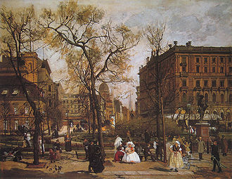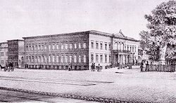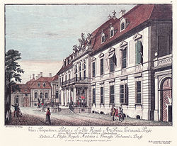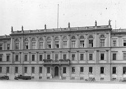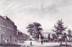 | The Palais Prinz karl (or Ordenspalais) at Wilhelmstraße and Wilhelmplatz in Berlin, showing the building with a neoclassicist outlook after reconstruction by Friedrich August Stüler; lithography by an unknown artist | Scan from book: Laurenz Demps: Berlin-Wilhelmstraße, Berlin 1994, p. 95 | Autor/-in unbekannt Unknown author | Datei:Berlin, Wilhelmplatz, Ordenspalais, um 1830.jpg | |