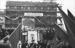 | Dieses Bild wurde im Rahmen einer Kooperation zwischen dem deutschen Bundesarchiv und Wikimedia Deutschland aus dem deutschen Bundesarchiv für Wikimedia Commons zur Verfügung gestellt. Das deutsche Bundesarchiv gewährleistet eine authentische Bildüberlieferung nur durch die Originale (Negative und/oder Positive), bzw. die Digitalisate der Originale im Rahmen des Digitalen Bildarchivs . | Autor/-in unbekannt Unknown author | Datei:Bundesarchiv B 145 Bild-P014779, Berlin, Erweiterungsbau der Alten Reichskanzlei.jpg | ||