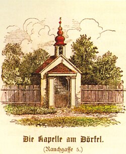 | Wilhelmsdorfer Kapelle, ursprüngliches Aussehen Dieses Bild zeigt das in Österreich unter der Nummer 25550 denkmalgeschützte Objekt. ( Commons , de , Wikidata ) | eigener Scan aus der Broschüre Meidling Kulturwanderweg 3, herausgegeben von der Stadt Wien (ohne Impressum) | Buchhändler | Datei:Wilhelmsdorfer Kapelle.jpg |