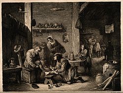 | A rural surgeon treating an elderly man's foot, in the background an assistant is mixing a concoction with a pestle and mortar amidst a busy workshop. Etching by W. Unger after D. Teniers, the younger. Iconographic Collections Keywords: Wilhelm Unger; David Teniers | https://wellcomeimages.org/indexplus/obf_images/83/ca/a9508f809c178733b9f7a127c14a.jpg Gallery: https://wellcomeimages.org/indexplus/image/V0016748.html Wellcome Collection gallery (2018-03-22): https://wellcomecollection.org/works/xb7r9vtu CC-BY-4.0 | William Unger / Nach David Teniers der Jüngere | Datei:A rural surgeon treating an elderly man's foot, in the backg Wellcome V0016748.jpg | |