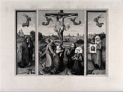 | The crucifixion of Christ; the three Maries lament. Etching by W. Unger after R. van der Weyden. Iconographic Collections Keywords: Mary Magdalene; Jesus Christ; William Unger; Roger van der Weyden; Salome; Mary | https://wellcomeimages.org/indexplus/obf_images/e5/43/b25e717bc9cd9f4579099ff62034.jpg Gallery: https://wellcomeimages.org/indexplus/image/V0034789.html Wellcome Collection gallery (2018-04-03): https://wellcomecollection.org/works/qnb6yen5 CC-BY-4.0 | Datei:The crucifixion of Christ; the three Maries lament. Etching Wellcome V0034789.jpg |
