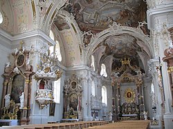 Das Kircheninnere ist in zartesten Farben gehalten, vermischt mit viel Gold und zierlichem Rokokostuck von Franz Xaver Feuchtmayer und Anton Gigl. Deckengemälde des Augsburgers Matthäus Günther zeigen Szenen aus dem Leben Mariens.