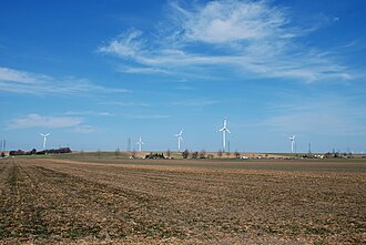 | Das Foto zeigt die fünf Windkraftanlagen des Windparks Bruck an der Leitha in Niederösterreich. Die Windkraftanlage rechts besitzt eine Aussichtsplattform. | Eigenes Werk | KoeppiK | Datei:Wind farm bruck an der leitha.jpg | |