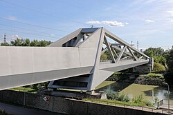 | Der südliche Teil bzw. die Donaukanal -Querung der eingleisigen Winterhafenbrücke nächst dem Hafen Freudenau (ehemals als Winterhafen bezeichnet) im 2. Wiener Gemeindebezirk Leopoldstadt . Die ursprüngliche Eisenbahnbrücke wurde Ende des II. Weltkrieges gesprengt und nicht mehr aufgebaut. Nach dem Bau eines Containerterminals neben dem Hafen, wurde die Verbindung zwischen der Donauuferbahn und der Donauländebahn wieder hergestellt und dazu die Brücke als das zentrale Bindeglied errichtet. Der Spatenstich für die 172 m lange Brücke erfolgte am 13. Februar 2007 und wurde nach einem Entwurf des Architekten Albert Wimmer gebaut. Sie ist eine asymmetrische Stahlbrücke, die mit dynamischer Linienführung aus einem Fachwerk über den Donaukanal und einer Trogbrücke über die Hafen-Einfahrt besteht. | Eigenes Werk | C.Stadler/Bwag | Datei:Wien - Winterhafenbrücke (2).JPG | |