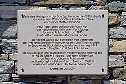 | Im Juli 2019 angebrachte Gedenktafel für Paul und Johanna Robitschek an der Hiata-Hütte der Winzer KremsWinzer Krems Sandgrube 13 . Die Keller der Sandgrube 13 wurden 1938 arisiert. | Eigenes Werk | Haeferl | Datei:Krems - Sandgrube 13 - Gedenktafel für Paul und Johanna Robitschek.jpg | |