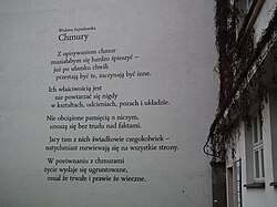 | Mural na pl. Kolegiackim w Poznaniu. | Eigenes Werk | MOs810 | Datei:Kolegiacki Sq. in Poznan, mural, Wislawa Szymborska.JPG | |