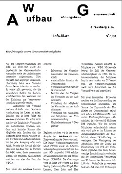 | erste Ausgabe der Zeitschrift für die Mitglieder der Wohnungsbaugenossenschaft "Aufbau" Strausberg eG aus dem Jahr 1997 | Eigenes Werk | Molgreen | Datei:19970101 xl WBG-INFOBLAT-Nr1-A-0001.jpg | |
