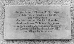 Die angeblich dreimillionste Wohnung (in Wirklichkeit 1,9 Millionen), die im Rahmen des Wohnungsbauprogramms seit 1970 gebaut wurde, wurde von Erich Honecker am 12. Oktober 1988 feierlich übergeben.