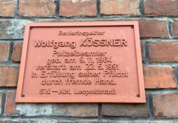 | Gedenktafel Wolfgang Kössner auf der Polizeiinspektion Ausstellungsstraße | Eigenes Werk | SchorschG | Datei:Gedenktafel Wolfgang Kössner auf der Polizeiinspektion Ausstellungsstraße.png | |