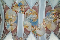1954 schuf er ein barockisierendes Deckenfresko anstelle der im Zweiten Weltkrieg zerstörten Fresken von Johann Michael Rottmayr in der Wallfahrtskirche Maria Lanzendorf. 1966 erhielt er den Auftrag, das im Zweiten Weltkrieg zerstörte Deckenfresko von Johann Zick im Fürstensaal des Bruchsaler Schlosses zu rekonstruieren. Diese Arbeit war 1968 beendet. Von 1970 bis 1974 malte er auch das Deckenfresko im Marmorsaal sowie drei Supraporten neu.[4]