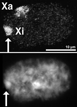 Kern einer weiblichen menschlichen Zelle aus Amnionflüssigkeit. Oben: Darstellung beider X-Chromosomen durch Fluoreszenz-in-situ-Hybridisierung. Gezeigt ist ein einzelner optischer Schnitt, der mit einem konfokalen Laserscanningmikroskop erzeugt wurde. Unten: der gleiche Kern mit Dapi-Färbung, aufgenommen mit einer CCD-Kamera. Das Barr-Körperchen ist hier gut zu erkennen (Pfeil) und identifiziert das inaktive X-Chromosom (Xi). Präparation wie in: R Eils, S Dietzel, E Bertin, E Schrock, MR Speicher, T Ried, M Robert-Nicoud, C Cremer and T Cremer (1996): Three-dimensional reconstruction of painted human interphase chromosomes: active and inactive X chromosome territories have similar volumes but differ in shape and surface structure. Journal of Cell Biology, Vol 135, 1427-1440. PMID:8978813. Website . | Steffen Dietzel, Dissertation an der Universität Heidelberg, 1996. ( Eigenes Werk ) | User:Dietzel65 , Steffen Dietzel | Datei:Sd4hi-unten-crop.jpg | |