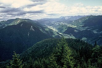 ![]() Blick vom Wasserkopf bei Hollenstein an der Ybbs durch das Ybbstal in Richtung Lunz am See |