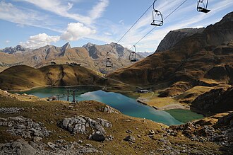 | Der Zürsersee im Lechquellengebirge mit der Madlochbahn und rechts die Muggengratbahn. In der Bildmitte am Horizont links die Roggspitze 2.747m und rechts die Valluga 2.809m in den Lechtaler Alpen . | Eigenes Werk | böhringer friedrich | Datei:Zürsersee 01.JPG |