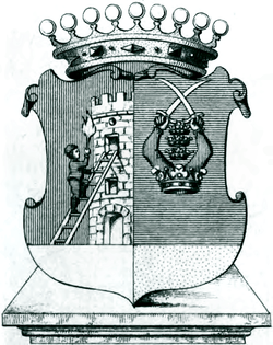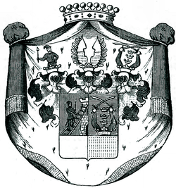 1830: Schild der Länge nach geteilt, rechts rot, links blau, mit einem von Silber und Gold der Lange nach geteilten Schildesfuß, welcher letztere ohne Bild ist. In der rechten roten Schildhälfte ein aus der Teilungslinie hervortretender, silberner Zinnenturm mit Fenster und offenem Thor, gegen welchen eine Leiter gestellt ist, auf der ein blau gekleideter, mit blauer, den Zipfel rechts wendender Sackmütze bedeckter Krieger emporsteigt, welcher sich mit der Linken auf die Leiter stützt, mit der Rechten aber eine brennende Fackel hält. In der linken blauen Schildhälfte eine goldene Krone, aus der zwei rotgekleidete Arme emporwachsen, welche in den Fäusten zwei in das Andreaskreuz gelegte Säbel halten. Zwischen den aufgehobenen Armen stehen drei goldene Kronen, eine über der anderen. Der Schild trägt drei gekrönte Helme; aus dem rechten Helme wächst der blaugekleidete Krieger der rechten Schildhälfte auf, welcher in der Rechten die brennende Fackel hält, die Linke aber in die Seite stemmt. Auf dem mittleren Helme steht ein offener, von Silber und Gold quer geteilter Adlersf1ug, und der linke Helm trägt Kronen, Arme und Schwerter der linken Schildhälfte. Die Helmdecken sind rechts rot und silbern, links blau und golden. Der Schildfuß (die Bezeichnung desselben als Feld 3 und 4 ist, der vorstehenden Abbildung gemäß, heraldisch nicht richtig, da die quere Teilung des Schildes nicht in der Mitte desselben, sondern im unteren Teile stattfindet) enthält das ursprüngliche Wappen der Familie. Der Schild war der Länge nach von Silber und Gold geteilt, und auf dem Schilde stand ein eiserner Helm mit einem offenen, von Silber und Gold quer geteilten Adlersflug. Im 14. Jahrhundert wurde das Wappen mit einem roten Felde vermehrt, in welchem ein silberner Turm steht, den ein Krieger mit brennender Fackel auf einer Leiter ersteigt. Bei Erlangung des Baronats, im Jahre 1560, kam noch ein blaues Feld hinzu, in welchem aus einer goldenen Krone zwei Arme hervorwachsen, die mit gekreuzten Schwertern drei goldene Kronen schützen. Bei Erhebung in den Grafenstand im Jahr 1830 wurde das Gesamtwappen mit einem Fürstenmantel, auf welchem die Grafenkrone ruht, geziert. Diese aus der Familie stammenden Angaben hat auch das Gen. Taschenbuch der gräflichen Häuser (1854. S. 888) benutzen können, und es hebt sich dadurch die Angabe im Jahrgang 1848 S. 765, dass die Kronen silberne Kronen wären.[1]