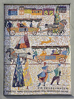Das Mosaik "Zeiserlwagen" befindet sich in Penzing , am Gemeindebau Linzer Straße/Amortgasse/Lenneisgasse/Goldschlagstraße. Es wurde 1954 von Johanna Schidlo-Riedl geschaffen und erinnert an die ab 1825 hier verkehrende Stellwagenlinie ("Zeiserlwagen"), die die Menschen aus der Stadt zur Sommerfrische in die Vorstädte brachte. Die Linie führte aus der Stadt kommend über die Penzinger Straße bis zum Café Dommayer . 1 | Eigenes Werk | Häferl | Datei:Wien-Penzing - Mosaik "Die Zeiserlwagen" von Johanna Schidlo-Riedl - 1956.jpg |