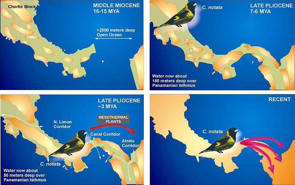 | Spinus/Carduelis notata lives today in Meso America. It is the extant ancestor of the South American Siskins. | Arnaiz-Villena, A; Areces C, Rey D, Enríquez-de-Salamanca M, Alonso-Rubio J and Ruiz-del-Valle V (2012). "Three Different North American Siskin/Goldfinch Evolutionary Radia-tions (Genus Carduelis): Pine Siskin Green Morphs and European Siskins in America". The Open Ornithology Journal 5: 73-81.doi:10.2174/1874453201205010073. | Arnaiz-Villena, A; Areces C, Rey D, Enríquez-de-Salamanca M, Alonso-Rubio J and Ruiz-del-Valle V (2012). "Three Different North American Siskin/Goldfinch Evolutionary Radia-tions (Genus Carduelis): Pine Siskin Green Morphs and European Siskins in America". The Open Ornithology Journal 5: 73-81.doi:10.2174/1874453201205010073. | Datei:Closing of Panama Isthmus and Spinus-Carduelis notata South American evolutive radiation.jpg | |