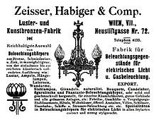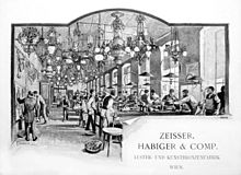 Zu diesem Zwecke wurde die Gesellschaftsfirma Zeisser, Habiger & Comp. gegründet (später: Gesellschaft für Beleuchtungskörper vormals Zeisser, Habiger & Comp.)[2]. Die Fabrik wurde an die Neustiftgasse 72 im VII. Gemeindebezirk verlegt und mit den modernsten Einrichtungen versehen. Die Betriebskraft wurde dem Kabelnetz der Wiener Elektricitäts-Gesellschaft (W. E. G.) entnommen und zahlreichen Elektromotoren zugeführt, die Arbeitssäle waren elektrisch beleuchtet. Auch wurde, um bei eintretender Feuersgefahr rasche Hilfe zu leisten, eine Feuermeldeanlage installiert.[1]