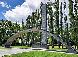 Neben dem axial direkt hinter der Kirche angelegten Ehrenmal für "Soldaten und Bürger der ehemaligen Sowjetunion, die durch die Auswirkungen ihr Leben verloren haben", existiert im Südosten ein „im Jahr 1961 neu gestaltetes internationales Mahnmal zur Erinnerung an die politischen Opfer des Faschismus der Jahre 1938 bis 1945". Es besteht aus einer 20 Meter hohen rechteckigen Stele und einem 20 Meter überspannenden Brückenbogen, auf dessen Scheitel eine (mittlerweile) gasbefeuerte Opferschale angebracht ist. In einem dazugehörigen Granitblock befinden sich 400 Urnen von NS-Opfern. An der wettergeschützten Unterseite des Brückenbogens sind 2510 Namen von Hingerichteten in Goldschrift eingraviert.“[3] Der Entwurf stammt vom bekannten slowenischen Architekten Boris Kobe (1905–1981), der noch kurz vor Kriegsende in das Lager Dachau und danach in das KZ-Außenlager Überlingen-Aufkirch verschleppt wurde.[4]