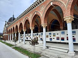 | In die denkmalgeschützten Arkaden wurde im Jahre 2009 eine aufgeständerte Urnenwand in der Art eines Kolumbariums installiert. Die historischen Gruften in der Rückwand sind damit verdeckt und schwer zugänglich. | Eigenes Werk | Peter Christian Riemann | Datei:Zentralfriedhof Graz, Gruftarkaden, 2023.jpg | |