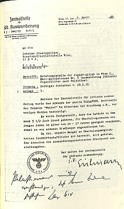 Im Sommer 1938 regten Löwenherz, Alois Rothenberg und Mitarbeiter der Jüdischen Gemeinde Wien bei Eichmann an, die bürokratischen Verwaltungsvorgänge für Auswanderungswillige zu vereinfachen. Der für das „angeschlossene“ Österreich zuständige Reichskommissar Josef Bürckel richtete daraufhin am 20. August 1938 die Zentralstelle für jüdische Auswanderung ein, die formell Walter Stahlecker unterstand, tatsächlich jedoch von Eichmann geleitet wurde.[1] Später wurde Franz Josef Huber als Inspekteur der Sicherheitspolizei und des SD in den Reichsgauen Wien, Niederdonau und Oberdonau der offizielle Vorgesetzte der Zentralstelle für jüdische Auswanderung.[2] Huber allerdings delegierte zahlreiche Aufgaben an seinen Stellvertreter Karl Ebner, der als die „graue Eminenz“[3] in der Wiener Gestapo galt. Die dokumentierten Weisungen an die Zentralstelle für jüdische Auswanderung tragen Ebners Unterschrift.