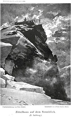 | Zittelhaus auf dem Sonnblick aus Zeitschrift des Deutschen und Oesterreichischen Alpenvereins 1894 Band 25 | austrian literature online | Michael Zeno Diemer | Datei:Zittelhaus 1894.jpg | |